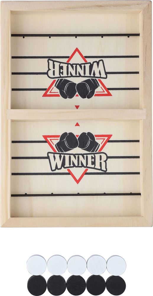 Houten lanceerspel. Bevat 10 schaakfiches (5 witte en 5 zwarte) en een handleiding voor eenvoudige opzet en gebruik. Een snel behendigheidsspel voor volwassenen met in totaal 11 onderdelen. Individueel verpakt in een bruine kartonnen doos met geïllustreerde binnenzijde.