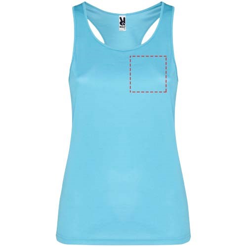 Technische, ademende, gemakkelijk te wassen en te drogen stof. Geribde armsgaten en halslijn. Racerback en zijnaden. Verwijderbaar label.