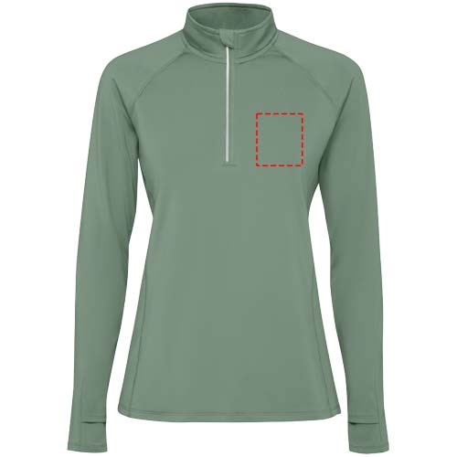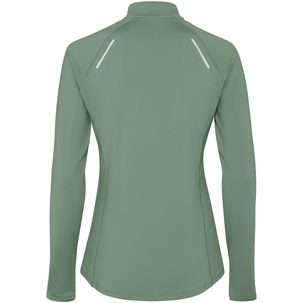 Technisch raglan sweater voor dames met lange mouwen. Slanke pasvorm. Kraag met een halve rits en een omgekeerd ontwerp met reflecterende details. Verstevigde naden. Manchetten met duimopeningen. Reflecterende details op de achterkant. De zoom aan de achterkant is iets langer dan aan de voorkant. Warme geborstelde binnenstof.