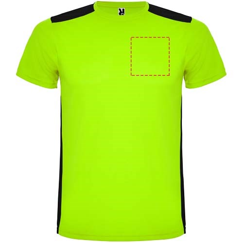 Gemakkelijk drogende, technische en ademende stof. Ronde hals. Combinatie van twee polyesterstoffen op de rug en schouders. Birdseye-stof aan de voorkant en ademende 3D-meshstof aan de achterkant. Stof voorbereid voor vochtopname. Decoratieve zigzagsteek aan de zijkanten en schouders. Rugpatroon is iets langer. Verwijderbaar label.