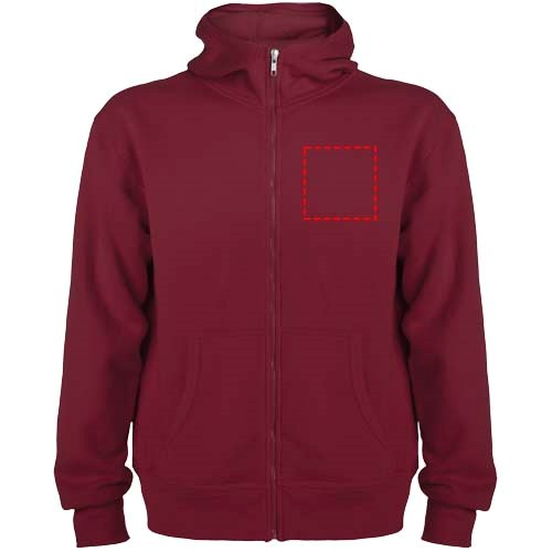 Sweatjack met capuchon, hostaande kraag en volledige rits. Geribbeld detail in capuchon en zakbies. Kangoeroezak. 2x2 ribboord aan manchetten en taille. Verwijderbaar etiket. Het model is 184 cm en draagt maat L.