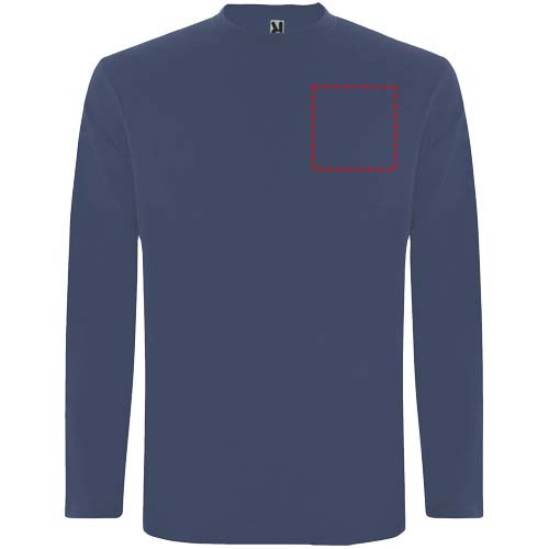 T-shirt met lange mouwen van buisvormige stof en 4-laags ronde hals. Versterkte bedekte naden in kraag en schouders. Geen manchetten. Verwijderbaar etiket. Buisvormig ontwerp in volwassen maten en zijnaden in kindermaten. Het model is 185 cm en draagt maat L.