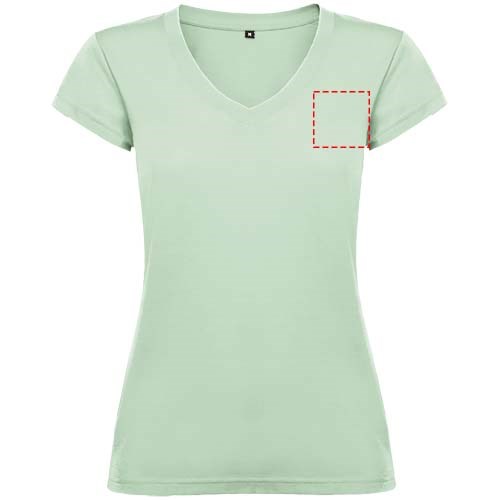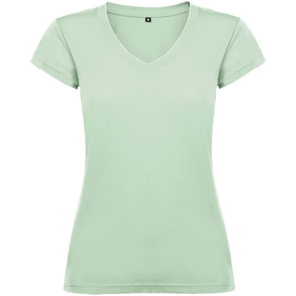 T-shirt met korte mouwen en V-hals voor dames, met 1x1 geribbelde afwerkingen. Slim-fit met zijnaden. Verwijderbaar etiket. Het model is 174 cm en draagt maat S.