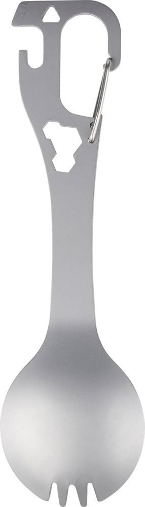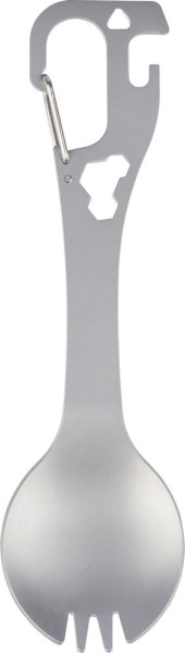 Spork van roestvrij staal met geïntegreerde vork en lepel, platte schroevendraaier, fles- en blikopener en drie inbussleutels in het handvat. Inclusief karabijnhaak. Per stuk verpakt in een papieren zakje.