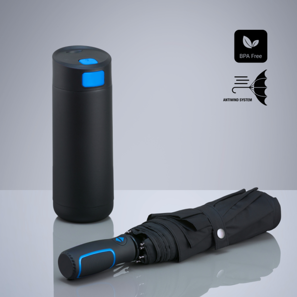 Een praktische set die een duurzame thermomok combineert met een robuuste paraplu. De koffiemok is gemaakt van hoogwaardig POSCO roestvrij staal, biedt uitstekende temperatuurbehoud en heeft een lekvrije deksel met een kleurrijke vergrendeling voor veilig gebruik. De paraplu is voorzien van een DAS-systeem (automatisch openen/sluiten) en een windbestendig mechanisme.