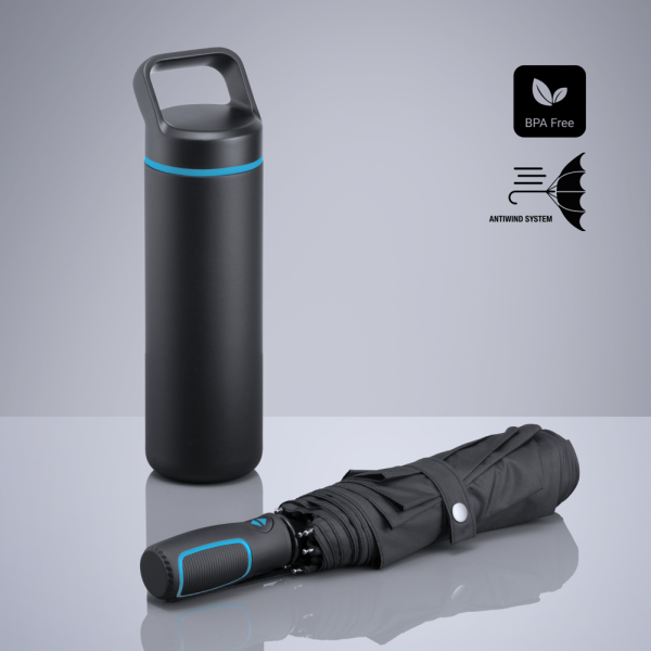 Een praktische dagelijkse set die een slanke POSCO roestvrijstalen waterfles combineert met een compacte, robuuste paraplu uit de Dynamic-collectie. De fles biedt duurzame, lekbestendige hydratatie met een veilige draaggreep in de dop en BPA-vrije, LFGB-gecertificeerde veiligheid. De paraplu zorgt voor betrouwbare bescherming dankzij de stevige constructie en het reisvriendelijke formaat. Een functioneel duo voor dagelijks woon-werkverkeer en onderweg.