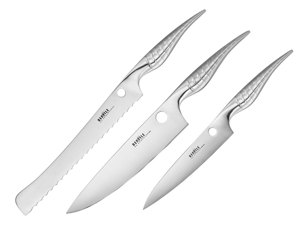 De Samura Reptile Set is een set van lichtgewicht messen gemaakt van AUS-10 staal met een naadloos overlopend RVS heft. Alle messen in de Reptile-serie hebben een getaperd handvat met een holle binnenzijde zodat ze erg licht zijn. Door de geribde zijden hebben ze meer dan voldoende grip. Heb je liever een kortere greep, dan biedt het karakteristieke gat van de Reptile-serie uitkomst. Deze zorgt voor een extra grippunt. De messen liggen uitstekend in de hand en zijn ideaal voor professioneel gebruik. De set bestaat uit een Utility Knife, een Chef Knife en een Bread Knive. De messen blijven het langst mooi als deze niet in de afwasmachine gereinigd worden.