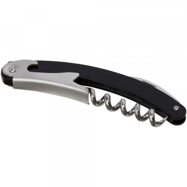 Roestvrijstalen sommeliermes met gekleurde behuizing met een foliesnijder en flesopener.meer
