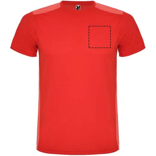 Gemakkelijk drogende, technische en ademende stof. Ronde hals. Combinatie van twee polyesterstoffen op de rug en schouders. Birdseye-stof aan de voorkant en ademende 3D-meshstof aan de achterkant. Stof voorbereid voor vochtopname. Decoratieve zigzagsteek aan de zijkanten en schouders. Rugpatroon is iets langer. Verwijderbaar label.