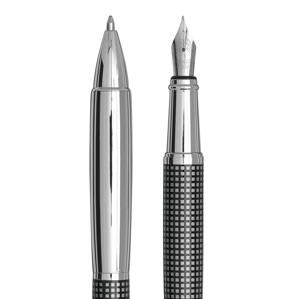Elegante pennenset NOBLESSE bestaande uit blauw schrijvende balpen en vulpen met ruitpatroon.