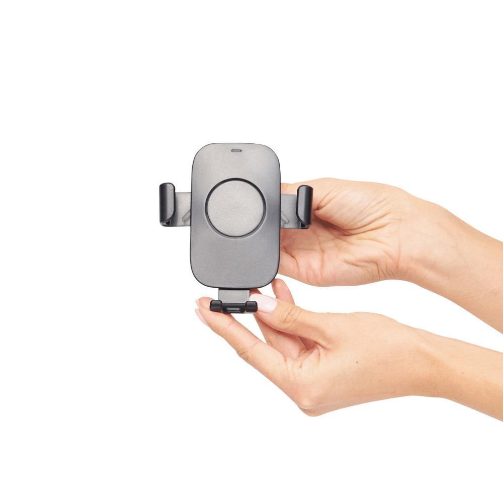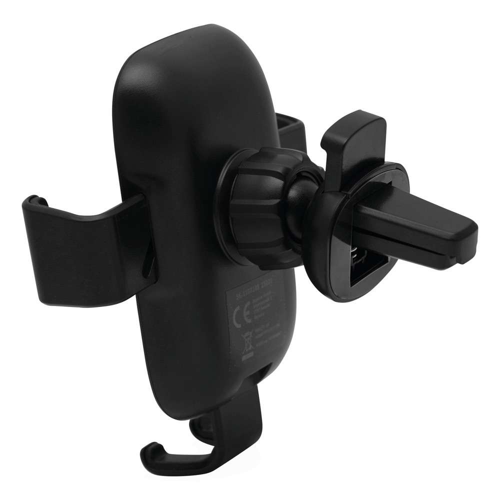 Telefoonhouder IN CAR: voor de meeste gangbare smartphones, met klem voor bevestiging aan ventilatieroosters (voor verschillende lamellendiktes), kogelgewricht voor optimale uitrichting, inductie-oplaadunit met geïntegreerde USB-kabel (1m.):