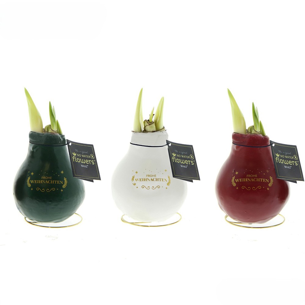 Alle No Water Flowers® zijn voorzien van een metalen steun waardoor de wax amaryllis neergezet kan worden en deze altijd stabiel blijft staan. De Originele No Water Flowers® zijn makkelijk te herkennen aan het label die aan de bol bevestigd is. Deze amaryllisbollen hebben geen verzorging nodig. Zet de wax amaryllis op een lichte plek, maar niet in direct zonlicht en geniet van de prachtige bloemen die zich binnen 3 tot 5 weken ontwikkelen. Bloembollen zijn natuurproducten, elke bol is uniek op zichzelf en heeft een andere vorm.