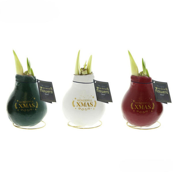 Alle No Water Flowers® zijn voorzien van een metalen steun waardoor de wax amaryllis neergezet kan worden en deze altijd stabiel blijft staan. De Originele No Water Flowers® zijn makkelijk te herkennen aan het label die aan de bol bevestigd is. Deze amaryllisbollen hebben geen verzorging nodig. Zet de wax amaryllis op een lichte plek, maar niet in direct zonlicht en geniet van de prachtige bloemen die zich binnen 3 tot 5 weken ontwikkelen. Bloembollen zijn natuurproducten, elke bol is uniek op zichzelf en heeft een andere vorm.