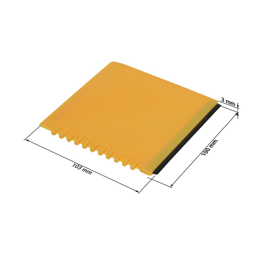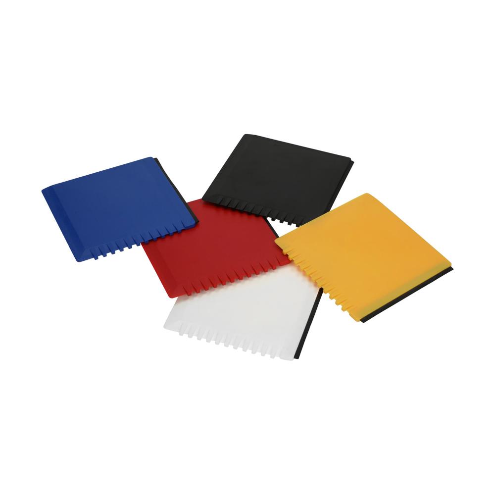 De met de plus. Handige, platte ijskrabber met krabtanden, gladde krabrand en waterafstrijker.