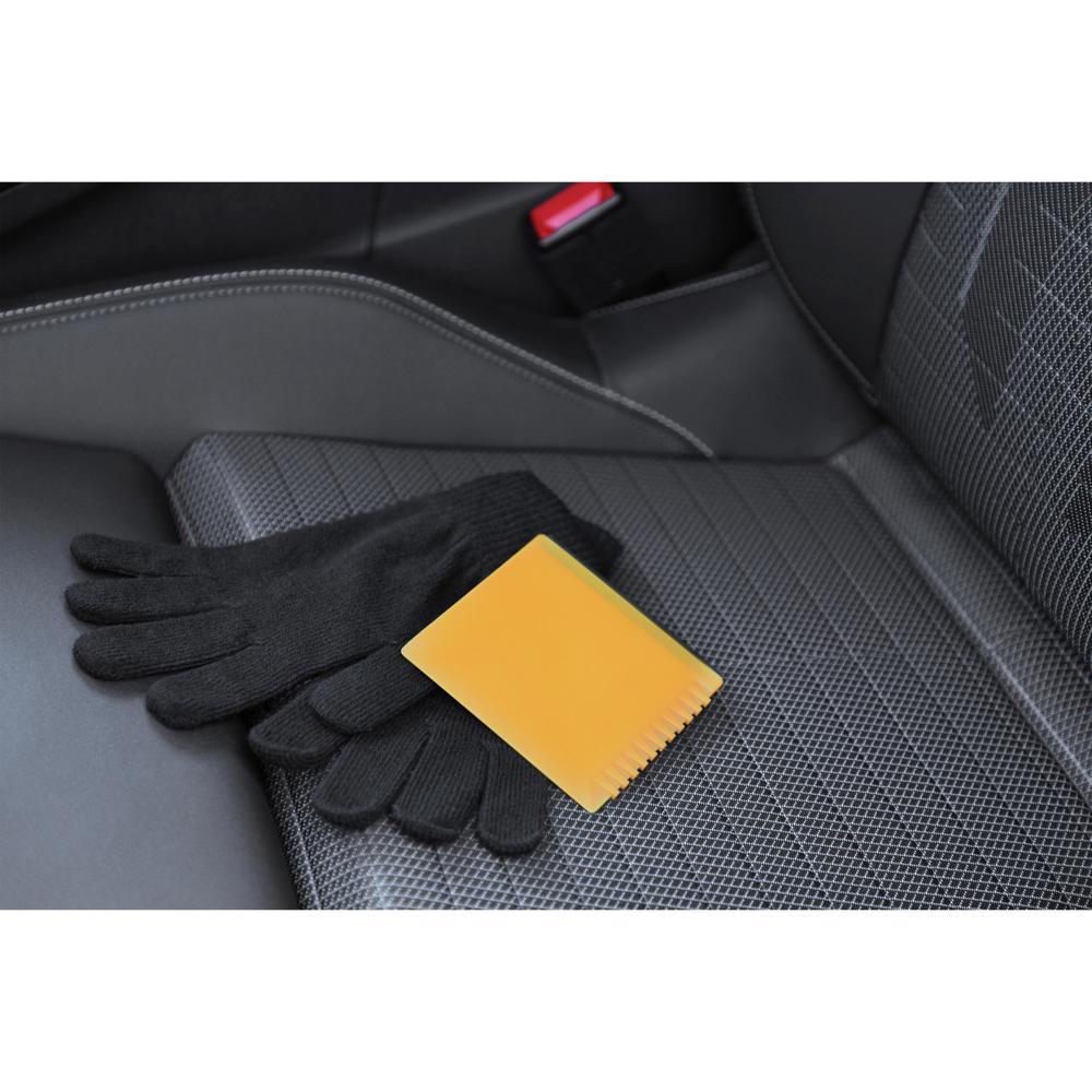 De met de plus. Handige, platte ijskrabber met krabtanden, gladde krabrand en waterafstrijker.meer