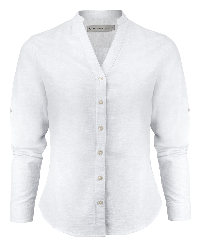 Linnenblend hemd met Mao kraag en aanpasbare manchetten. Parelmoer knopen. Contraststof aan de binnenkant van de schouderpas en manchetten. Garen geverfd.