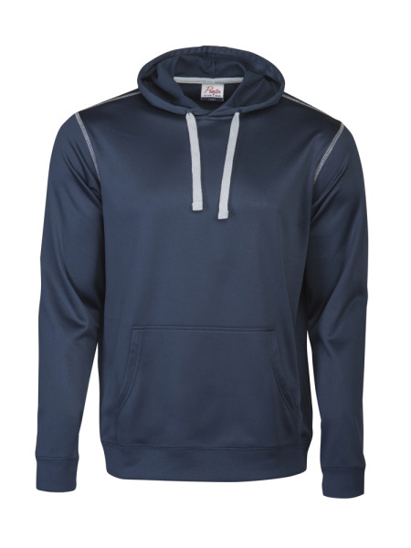 Polyester sweatshirt met capuchon. Contrasterende flatlock naden aan de schouders en mouwopening. Binnenzijde is geborsteld voor een zacht en warm gevoel. Ook verkrijgbaar in kindermaten.