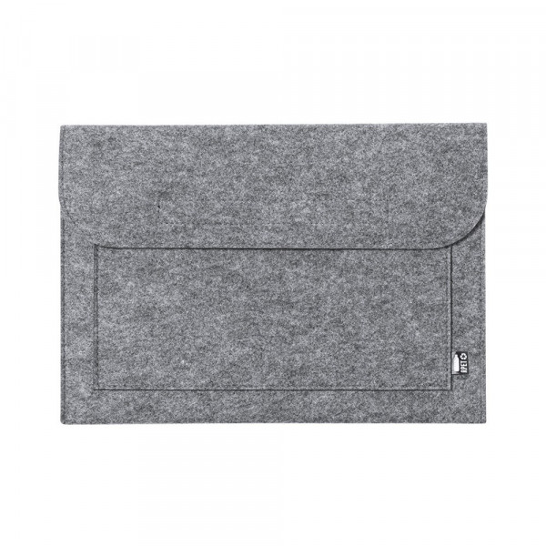 Natuurlijn laptophoes van resistent, gerecycled RPET-vilt. Het resultaat van de combinatie van de recyclageprocessen van plastic materialen samen met de duizendjarige techniek van viltproductie, wat resulteert in een eco-trendmateriaal dat niet alleen van gerecycleerde oorsprong is, maar ook recycleerbaar wordt. Klep met klittenbandsluiting en voorvak, met RPET-embleem op het buitenlabel.