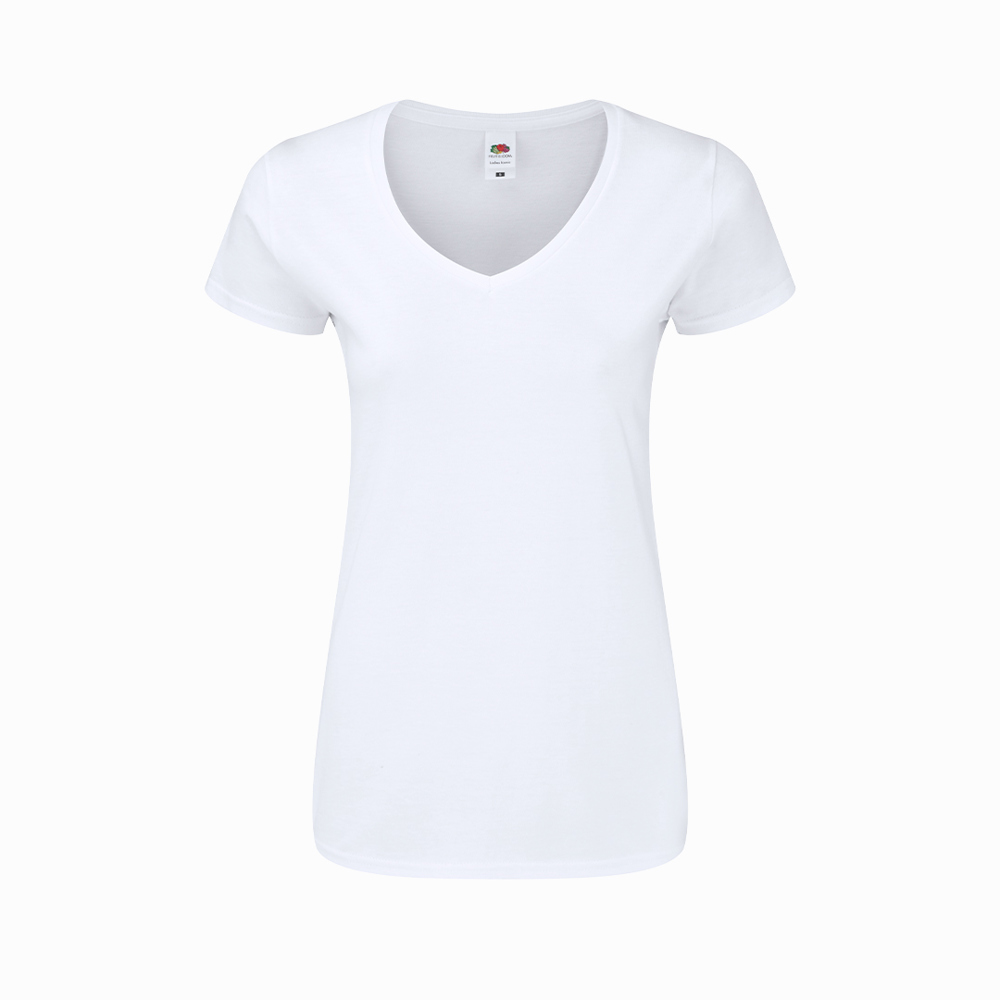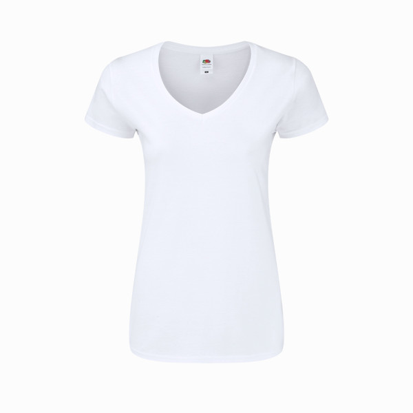 Wit dames-T-shirt Iconic V-Neck van Fruit Of The Loom. Gemaakt van 100% geborsteld katoen Ring Spun 140g/m2. Zachte touch en slanke pasvorm, met zijnaden ontworpen voor een perfecte pasvorm. Smalle 1x1 geribde V-hals en bijpassende placket. Gemakkelijk te verwijderen label en verkrijgbaar in de maten XS, S, M, L, XL, XXL.