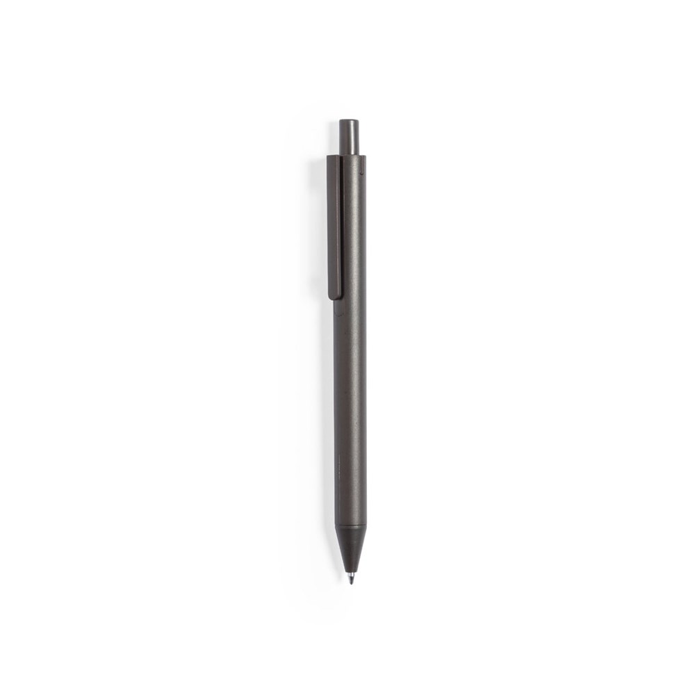 Natuurlijn pen, met een behuizing gemaakt van koffievezels en bijpassende details. Drukknopmechanisme en blauwe inkt, met een embleem van koffievezels op de behuizing.