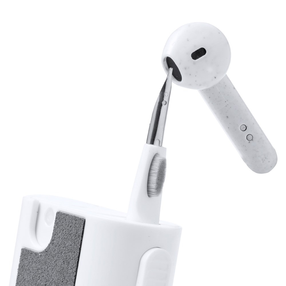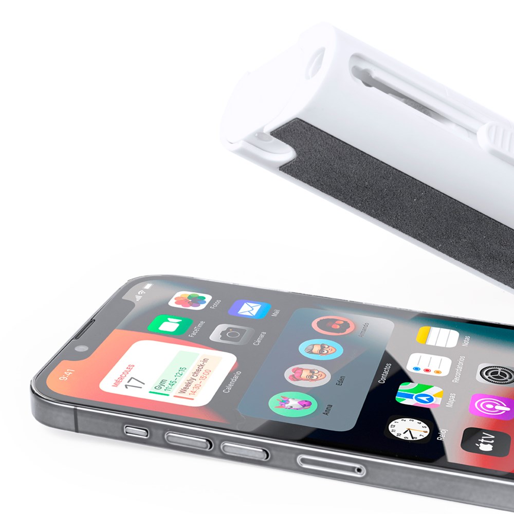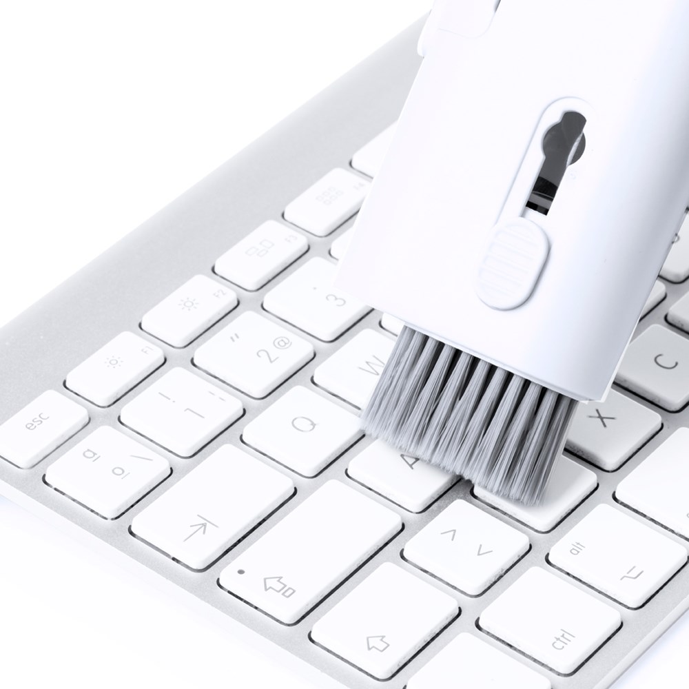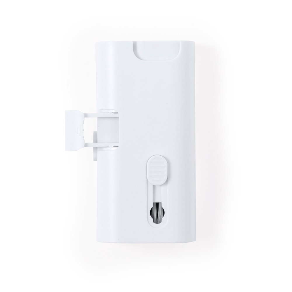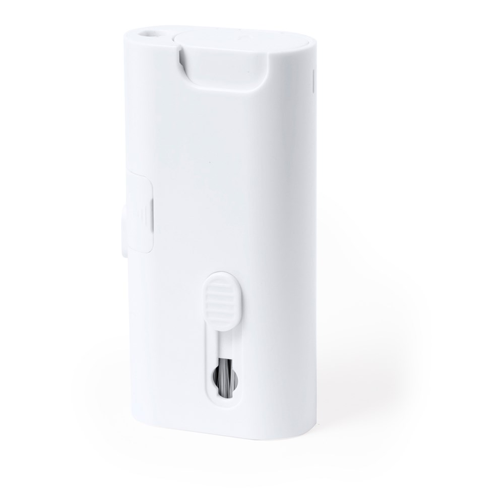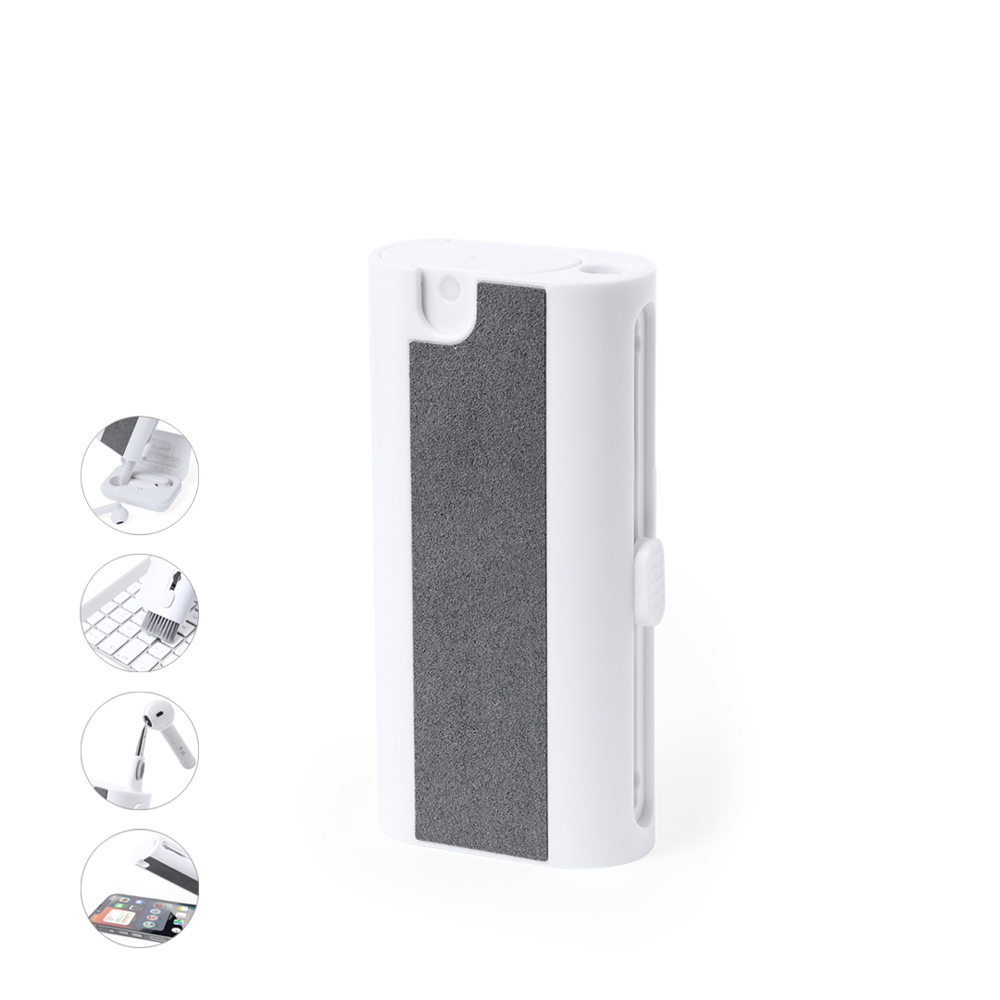 Complete reinigingsset met 6 functies, speciaal ontworpen voor de verzorging en het onderhoud van technologische snufjes. Alle accessoires bevinden zich in de behuizing en zijn klaar voor gebruik door de bijbehorende knop te verschuiven. Inclusief hervulbaar binnenreservoir met sproeier, schermreinigingsgedeelte, metalen punt, schoonmaakstaafje, borstels in verschillende vormen en accessoire voor het verwijderen van de sleutel. Gemaakt van resistent ABS, met elegant wit design en individueel gepresenteerd in een kraft-designdoos.