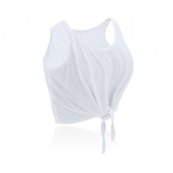 T-shirt voor dames van zacht polyester 130 g / m2. Geknoopt aan de voorzijde. Verkrijgbaar in het wit en felle fluorescerende kleuren. Maten S, M, L.